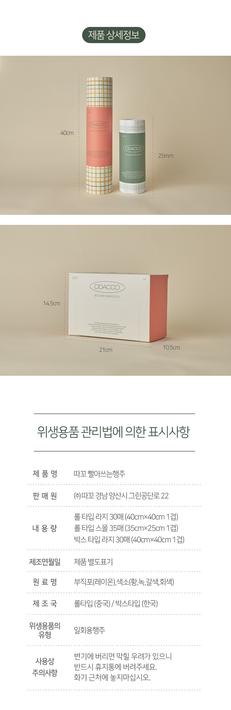 롤행주라지(40x40) 1개, 롤행주스몰(35x25) 1개 구성 입니다.